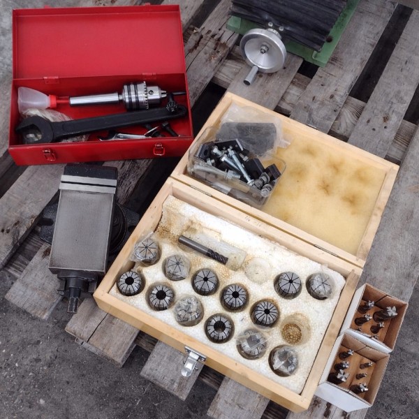 With ER32 Collet chuck, ER32 collets, clamps and End Mills.